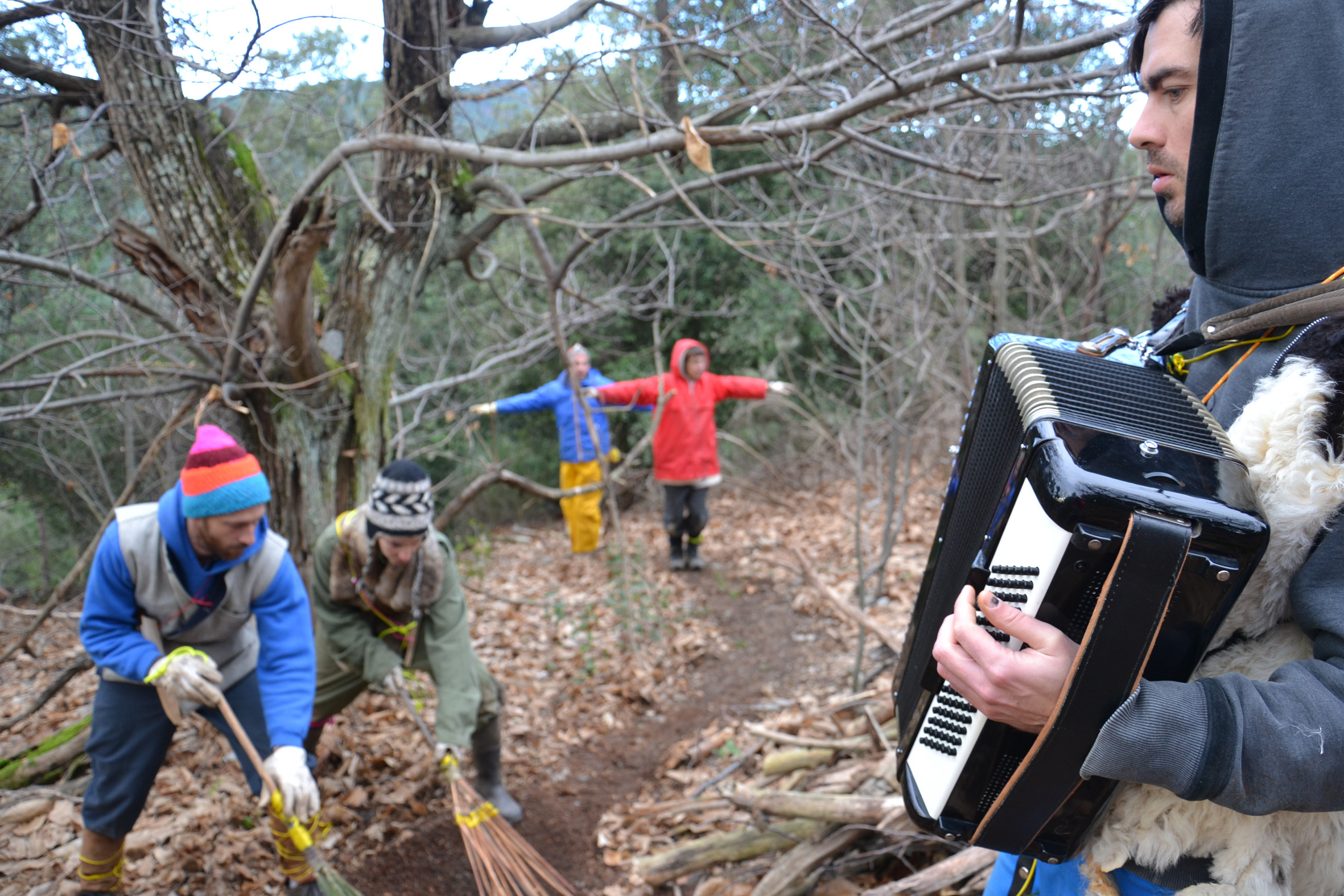 Le Chant des sentes est un parcours artistique qui mêle la danse, le chant et le paysage. Cinq artistes sont réunis par Mathias Poisson pour une résidence sur le terrain communal de Lamelouze. Ils fouillent le périmètre puis, ils agissent sur place, formant et déformant sensiblement des espaces cachés dans la broussaille des pentes cévenoles. Ils parlent de « ménagement » plutôt que d’ « aménagement », parce que leurs interventions sont discrètes, elles se font sans plan, sans machine et sans matériau extérieur, guidées par le rythme des danses et des chants qui émergent sur place.